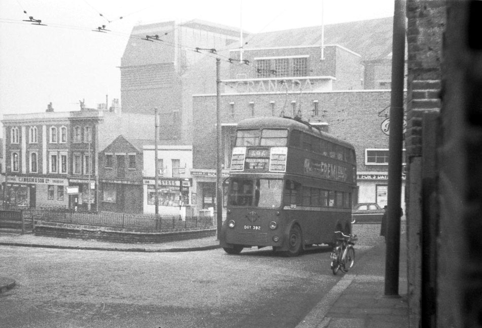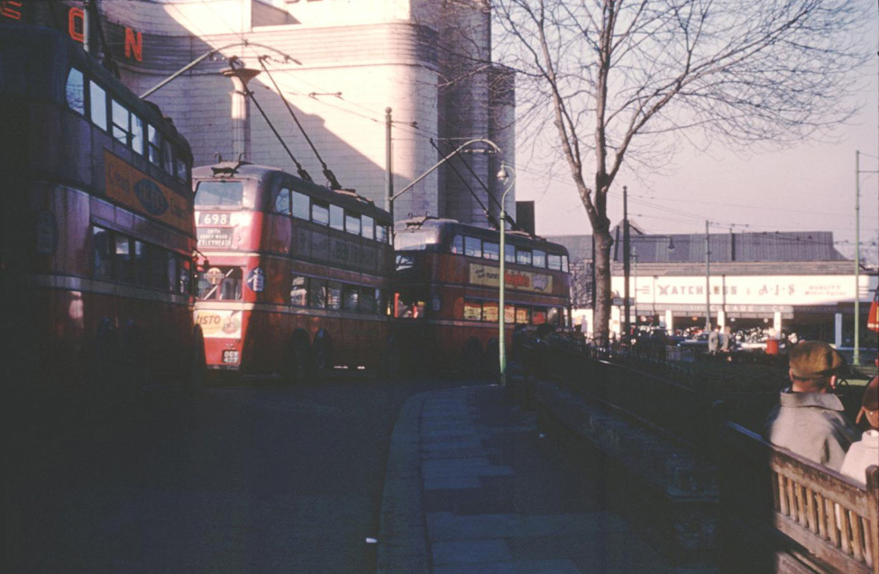 ![]() ![]() ![]() ![]() Pictures 398, 400, PH1 and D2. Woolwich, Parsons Hill terminus. In picture 398 the trolleybus has just turned off from Woolwich High Street into Powis Street. For John Webb the electrical shop on the corner he knew better in the 50s as a toy shop - Dinky and Meccano in particular. Trolleybuses travelled for a few yards down Powis Street before turning into the Parsons Hill Turning circle. The building with the two shuttered doors was Woolwich ambulance station. When the road was widened for the new ferry approach, this building was left in the middle of the new roundabout for a while until the new ambulance building was built next to the new ferry buildings. It is interesting to see in picture 400 that the venue to the left was catering for 'teen-agers'; a term unheard of until the end of the 1950s. ![]() The Enon Chapel and all the other buildings were also torn down to make way for the new ferry approach and buildings. The shop was pulled down to widen Parsons Hill into John Wilson Street making the Granada as the corner building. Today, the only buildings left in Parsons Hill are "The Castle" Pub and the Chinese Restaurant next door. ![]() |