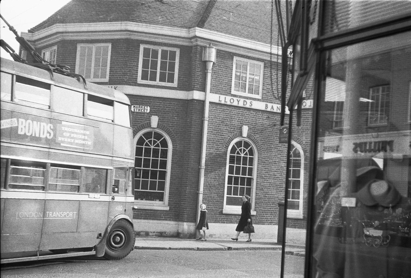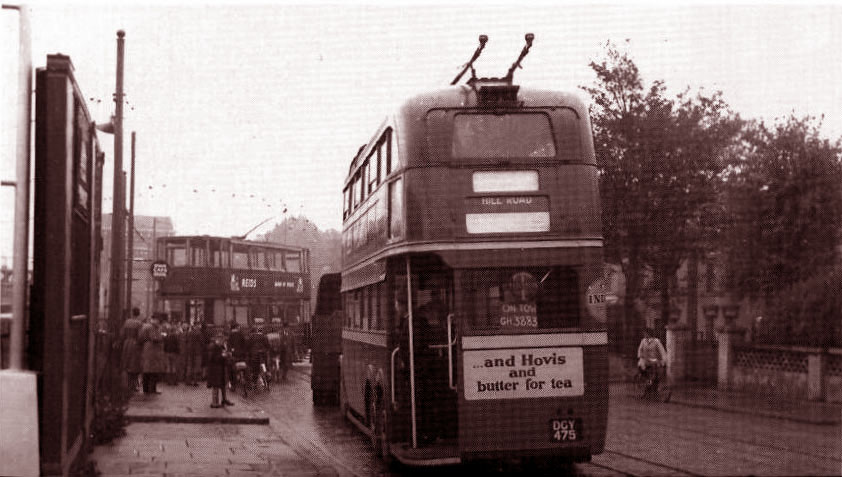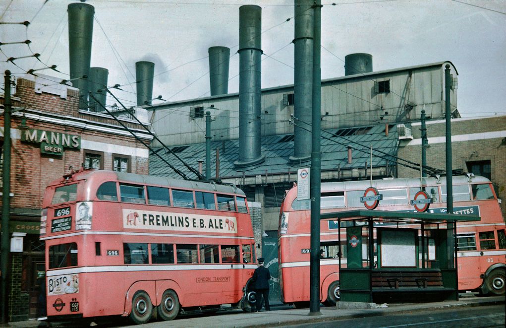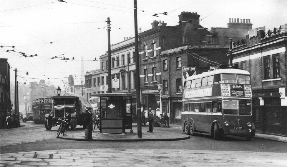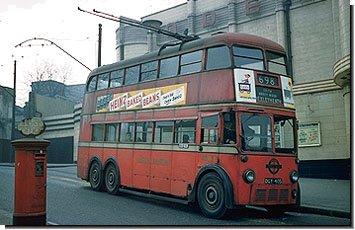 ![]() Picture GW32 A c1938 picture of the Market Hill terminus at Woolwich. [The adjacent picture is the same place but facing the other way]. The silver coloured roof of the trolleybus was thought to be too visible for wartime conditions and became brown instead. |