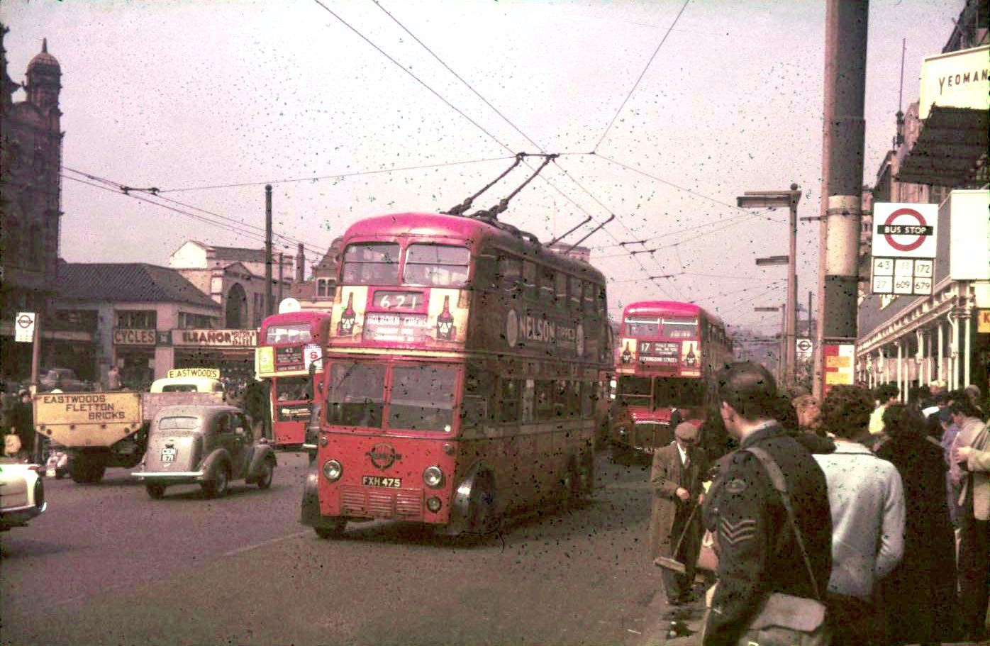 Finchley North London with trolleybus wires and trolleybuses under them EVERYWHERE. The 611 left us at Archway, their short wheelbases climbing