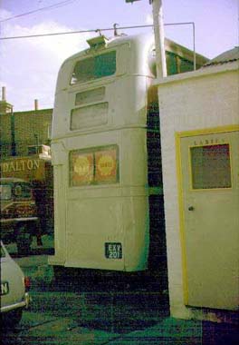 This trolleybus was used mainly for storing spares at a garage in Shepherd's Bush. As you can just see in the photograph, it was repainted white except for the off-side, which faced a wall. It was restored at Sandtoft [largely, or perhaps almost entirely, by Brian Maguire] during the 1990's and now runs at Carlton Colville, where I believe it is owned by the LTPS, who rescued it from Shepherd's Bush in the first place. Apart from the exported and [original] museum vehicles, this seems to have been the only London trolleybus to have escaped the breaker's torch.