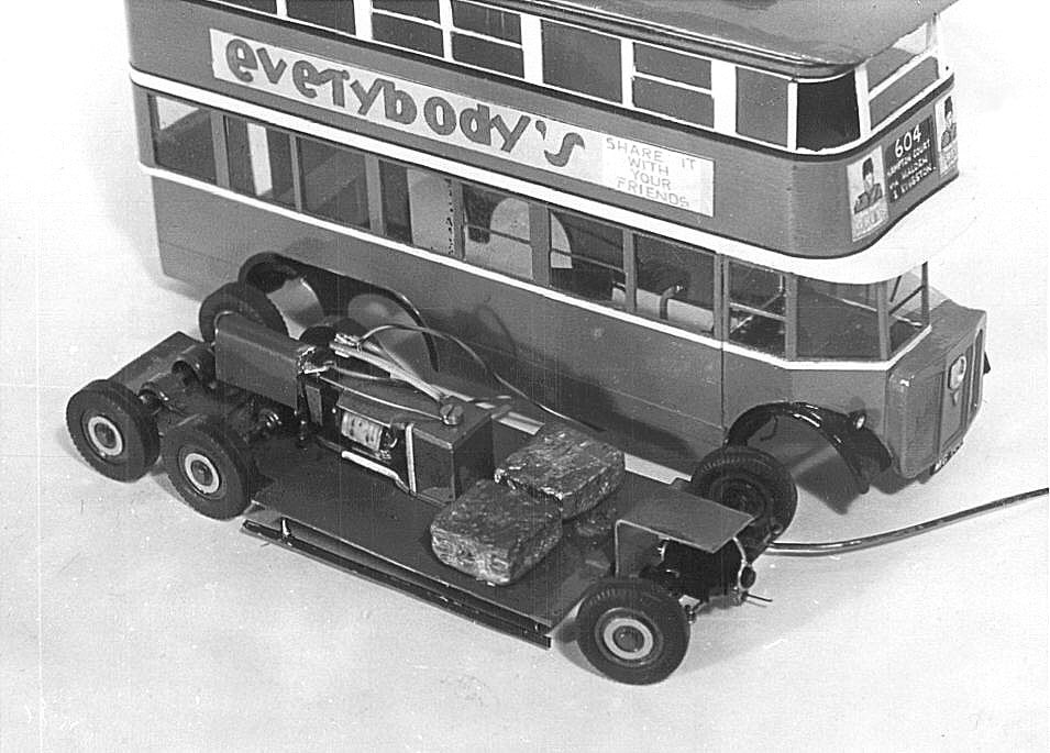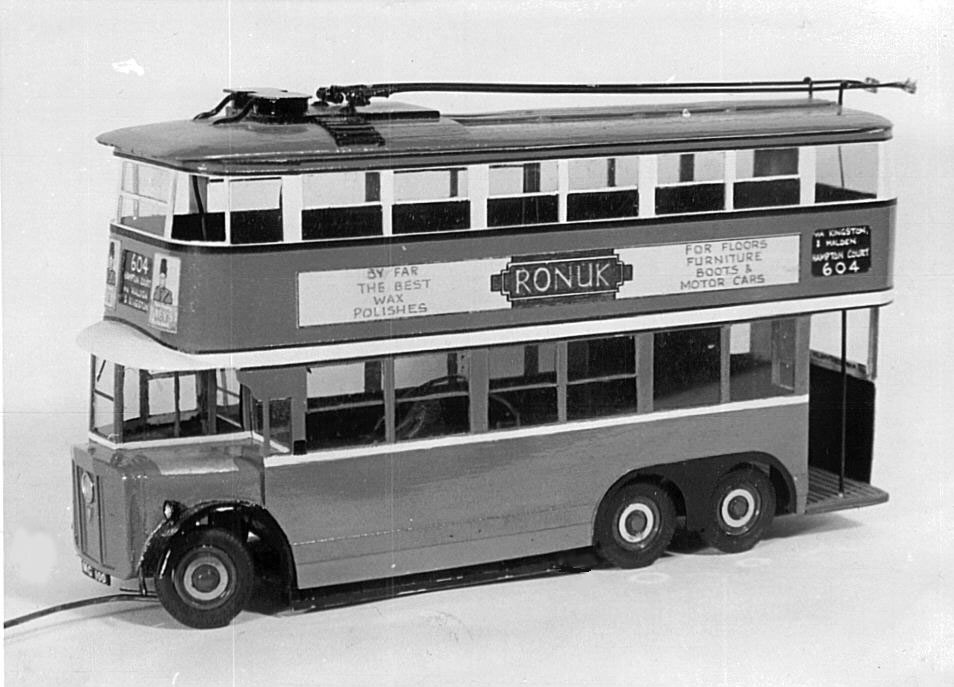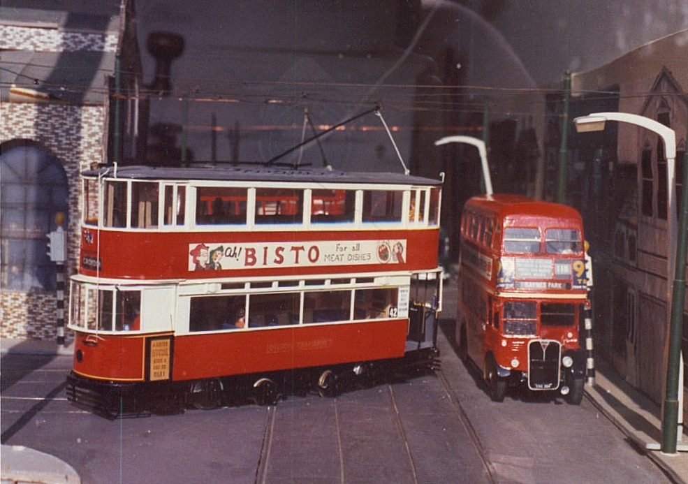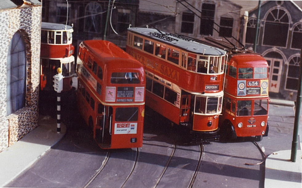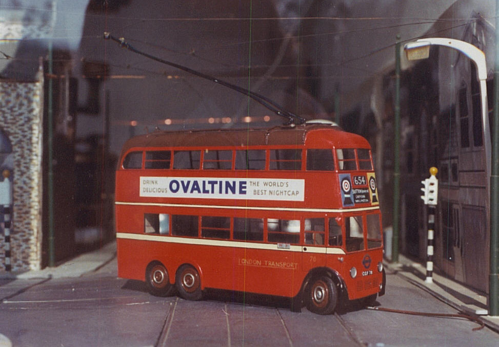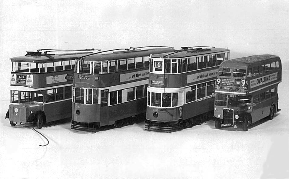 ![]() Picture TR2 London Transport collection. Left to right, E/3 tram No. 1905, RT2056 bus, Rehabilitated ex Croydon Corporation E/1 tram No.380 and B1 Trolleybus No.78 all scratch built around 1962 and still running in 2000 except the RT which is static. |